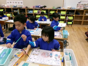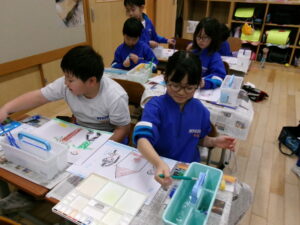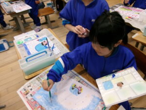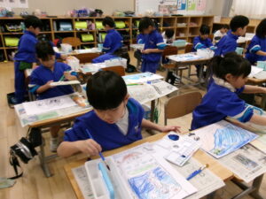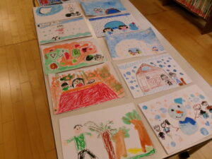 1年生。冬休みの思い出の絵が完成しました。だれの作品とも似ていない、「自分らしい絵」が出来上がりました。とても楽しんで描いていました。すばらしいですね。