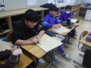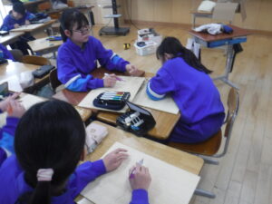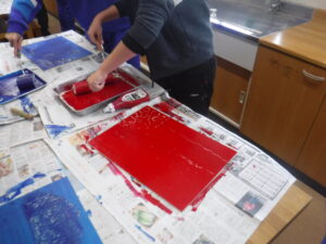 5年生。生き物を下絵に描いていましたが、版を両面で彫っています。赤か青の背景を擦り始めました。ここに、「生き物」を重ね刷りするようです。毎回、図画工作科が工夫されています。完成を待ちましょう。