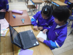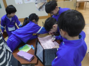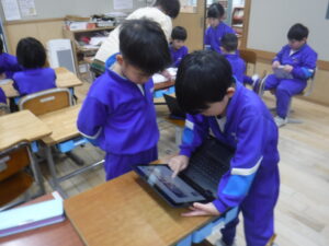 1年生。毎月の「おたんじょう会」を自分たちで考えて準備しています。仲間全員のお祝いをする意味と、「企画・準備・運営」をある程度のスタイルに慣れ、自分たちで進めることができるようにしています。1年生担任の森田先生の今年度の挑戦のようです。自分たちで考えて、動くのが一番、成長します。1年生も2年生も、実は、こういう活動が多く、低学年の方が上手かもしれません。1年生は、タブレットもすでにかなり上手に使っているのです。