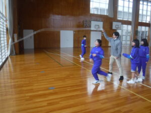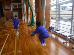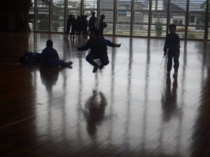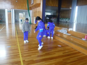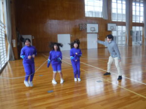 5年A組の体育をのぞいてみると。いろんな「なわとび」をしています。勝田先生と長縄の練習コーナーもあれば、2人で縄跳び、一人で足に縄跳びをつけて、自分の「なわとびカード」で練習する子も多いです。全校で一番上手な2人がいました。「後ろ三重跳びが、1回」ということです。いろんな方法で取り組めるのがいいですね。