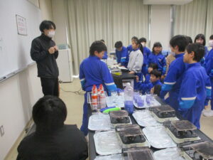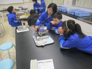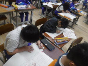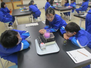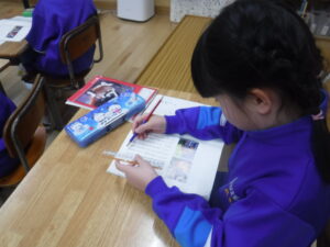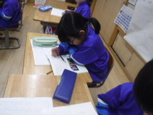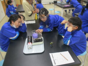 4年生A組の理科。理科は、両組とも大越先生です。「ものの温まり方」で、「水の温まり方」を考えています。黄色の絵具で前回は確認しましたが、今回は「示温インク」です。常温で青色、温めるとピンク色に変色する示温インク(サーモインク)は、その変色が興味深いようです。下から温めているのに、水の上からピンク色になるのに、子供たちは驚きでした。やはり、理科って面白いでしょ。