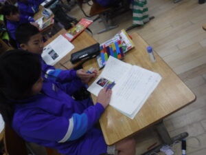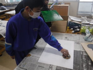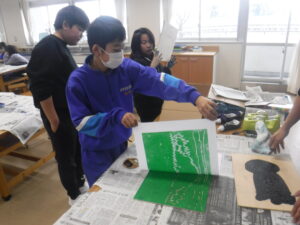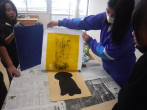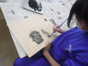5年生の図画工作科。一版多色の版画です。背景に1色刷りをし、「生き物」は黒色で刷っています。今日、仕上げの刷りをし始めました。まだ、丁寧に掘り進めている子たちもいます。背景の鮮やかさに「主役」の黒色がきれいに刷り上がっています。