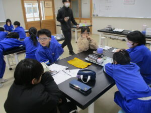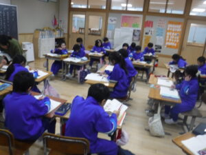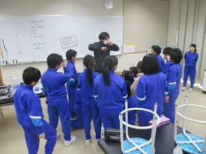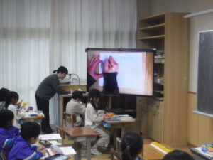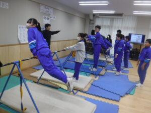 6年生の体育。太田先生の授業ですが、山本先生も参観。「てつぼうルーム」と「なわとびルーム」に分かれて学習。なわとびルームは、2本のロープを使う「ダブルダッチ・ジャンプ」に取り組んでいます。鉄棒は、もうすぐ「最後のテスト」ということで、これまでの技の確認と練習でした。雪が降っていますが、温かいのがいいですね。恵まれた環境です。