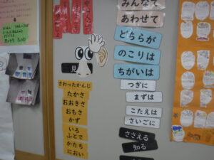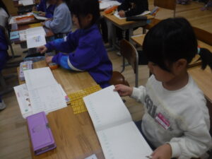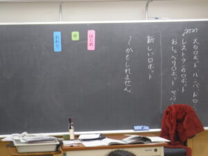 2年生の国語科、説明文「ロボット」の学習。これまで学んできた、「説明文の見方」を使っています。「はじめ」「なか」「おわり」や「問い」と「答え」という視点(見方)が明確になっています。そして、赤えんぴつ、青えんぴつでラインをひく。こういう国語科の「見方」を整理して、使えるようにして学年を終えるのです。次に新しい説明文を読むときの、大切な道具となります。2年生、使えるようになっていました。壁には、「見方」の思考パーツが、いつでも使えるように並んでいます。