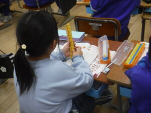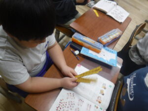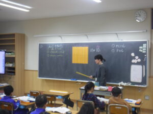 1年生の授業を観ると、とても参考になります。初めての小学生に、どんなステップで「学習の仕方」「学習規律」を身に付けさせていくのかが、よくわかるのです。今日は、「100」の数でした。「10」のかたまりを10本。何度も数えて、さわって、その量感も感じさせます。黒板の視覚教材は、大きなものを使い、ノートの「書き方」は、実際に拡大して、書きかたを見せます。最初に身に付ける「ノートの書き方」は、とても大事ですね。子供たちも、森田先生の「書くとおり」に、書こうとしています。1時間で、次に使える力がついていきます。1年生の先生って、すごいですね。
