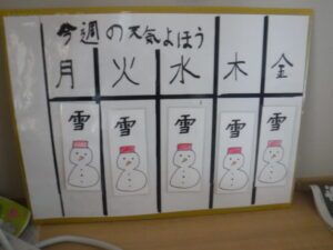 3年A組の新しい係、「天気予報係」があります。今週の予報が出ていました。今週の金曜日は、「6年生のスキー学習」なのですが。天気予報とにらめっこです。