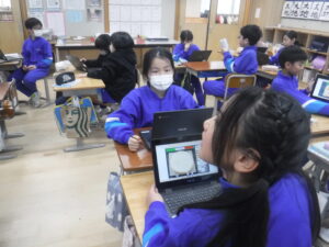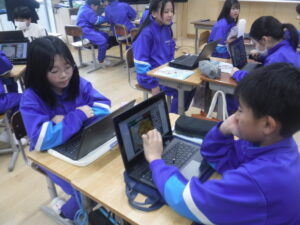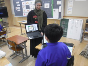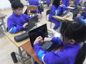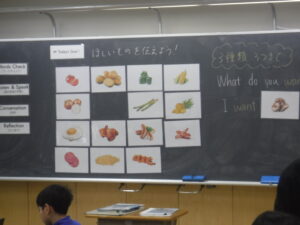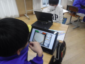 4年B組の外国語活動。タブレットでピザのトッピングを動かしながら、英語で自分のほしいトッピングを伝えます。「What do you want?」「I want トッピング.」です。3種類のトッピングと何個のせるかまで注文しています。実際に注文を受けたピザを相手の子がタブレットで完成させて、お届けします。あいかわらず、すごいタブレットの活用です。学習展開の企画は、廣田先生。ネイティブな発音は、ナディア先生。強力なTTによるレッスンです。