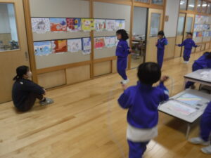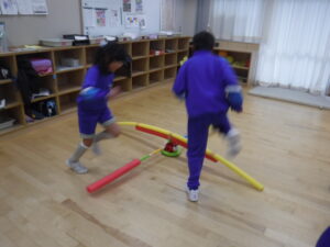 寺﨑先生が、「なわとびのジャンプがスムーズにできないかな」と開発、製作しておられた「なわとび練習マシーン(仮称)」が完成し、さっそく跳んでいました。柔らかいスポンジの棒が、回転します。それを両足ジャンプ、片足ジャンプを繰り返して、よけます。当たっても痛くありません。先生の一工夫が、子供たちの発達を促します。これは、すごい。