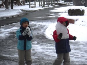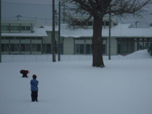 大休憩。雪がふれば、当然、雪で遊びます。2年生の二人は、服装を完璧に準備しているのに、感心しました。以前は、手袋なし、帽子なし、体操服。びちゃびちゃになって「濡れた~」ということもありましたが、遊びの準備も立派です。冬は、服装や手袋等、必要なことの準備が、いかに大事かを学ぶ、いい季節ですね。ご家庭での準備、ありがとうございます。さあ、雪遊びをしましょう。