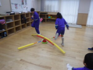 寺﨑先生が、「なわとびのジャンプがスムーズにできないかな」と開発、製作しておられた「なわとび練習マシーン(仮称)」が完成し、さっそく跳んでいました。柔らかいスポンジの棒が、回転します。それを両足ジャンプ、片足ジャンプを繰り返して、よけます。当たっても痛くありません。先生の一工夫が、子供たちの発達を促します。これは、すごい。