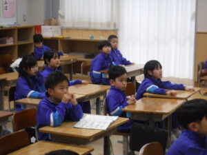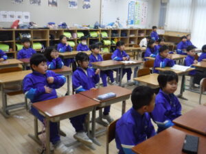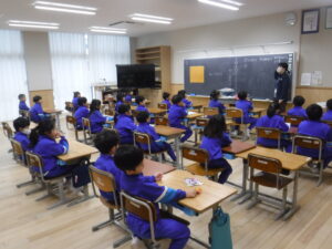 雪がふりました。1年生の朝の会です。雪が降ったタイミングで、森田先生の指導です。「登下校のゆきあそび」「登下校のゆきなげ」をしてはいけないことについて。今日、これをしないと、子供たちは、きっとするでしょう。雪はそれほど魅力的です。してはいけない理由を明確に話して、繰り返し、確認しています。1年生は、とても真剣に聞いています。1年生の時に、どんな指導が必要なのか、とても参考になります。その時に、機会を捉え、繰り返すことが大事ですね。特に、登下校の安全のために。