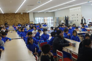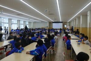 5時間目に、集会「体・ニコニコフェスティバル」が行われました。2つの委員会のコラボレーションによる集会です。今回は、「給食委員会」と「環境ボランティア委員会」が企画した内容です。最初は、給食委員会から、「伊藤先生と調理員さんへの感謝」を伝える「各学年からのプレゼント」、「給食標語の発表」、「給食クイズ」そして、「リクエスト給食のメニュー決定」と進みました。