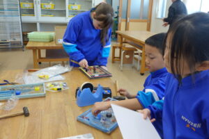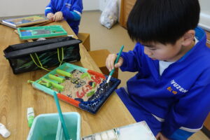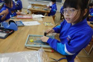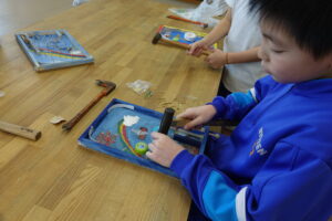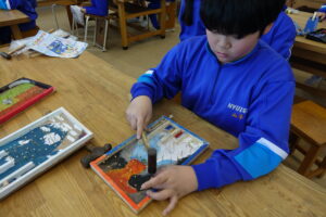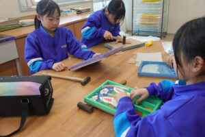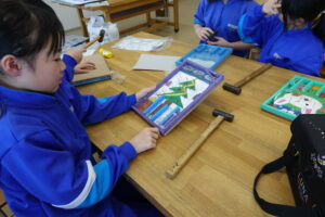図工科のコリントゲームも仕上げが近づいています。色塗りがきれいでも、玉が動かないと、ある程度、いろんなところに動いて、ポケットに入らないとゲームになりません。この釘の調整が、実は一番大事なんですね。おもしろいコリントゲームになりますでしょうか。学習参観で、どうぞご覧ください。
