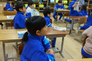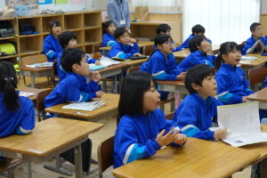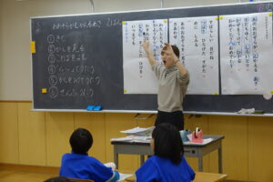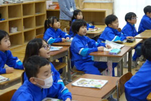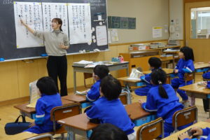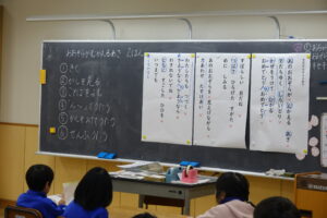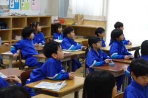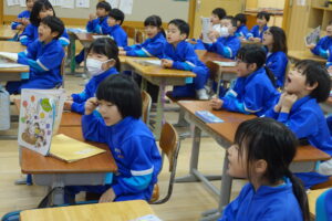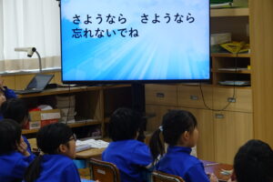 1年生の音楽。四杉先生の授業です。卒業式の「大空がむかえる朝」、そして「6年生を送る会」の「キセキ」の2曲を歌っています。初めての1年生ですので、2つの歌の歌詞を覚えなくてはなりません。歌は、とても上手です。歌詞を覚えてね。