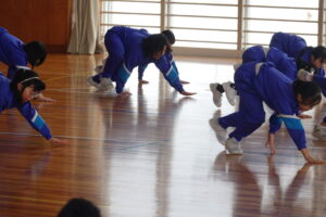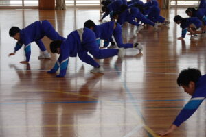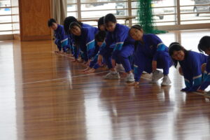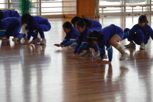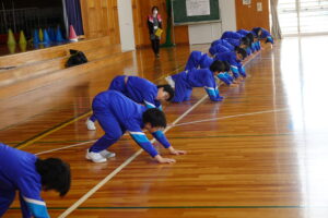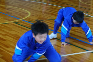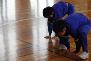 4年生A組の体育。「とび箱運動」の予定になっていました。ウォーミングアップ中で、「動物の歩き方」をやっています。四足歩行は、1年生もやっていましたけど、なかなか難しい。頭と体が、うまくつながらない感じです。でも、4年生はどんな運動でも、素直に真剣に取り組んでいます。最後に「ウサギ」の動きがありました。ウサギは、後ろ足が、前足を追い越すのです。まさに、とび箱の開脚跳びの体重移動です。なるほど、いい準備運動ですね。とび箱を意識する前に、同じ動きに取り組んでいます。さあ、とび箱はどうでしょう。