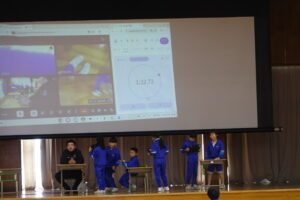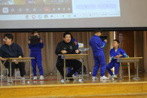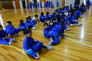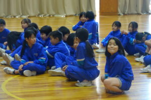 体育館に3つの学年が集まっています。4年生の体育のところに、「3年生もそろそろステージの動きを確認しないと、間に合わない」との判断で、前部を利用させてもらっています。5年生の進行の人たちも、進行の練習を始めています。来週の水曜日の本番に向けて、ピッチが上がってきました。
