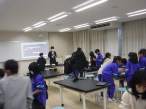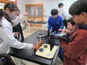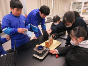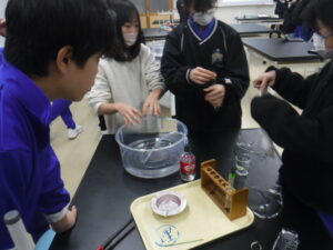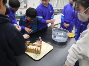 6年生の理科は、水溶液の分類(酸性・中性・アルカリ性) の学習。様々な水溶液(食塩水、炭酸水、石灰水、塩酸、アンモニア水など)を対象に、それらの性質を調べ、分類します。水溶液を蒸発させて、何か残るかどうか、においはあるかないかで、水溶液が何かを見つけていきます。山本先生から、実験の手際が良くなってきたと褒められる6年生。理科もそろそろ終わりが近づいてきました。6年間で、一番、科学的な学習に取り組んでいます。