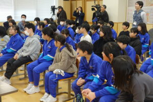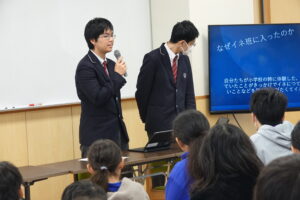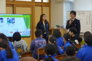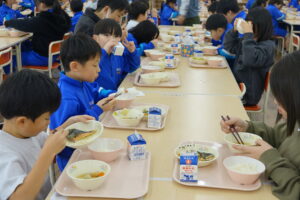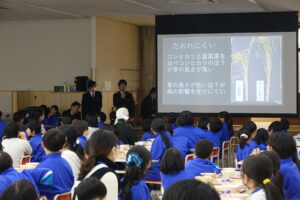 給食の前には、全校に向けて、ショートバージョンのプレゼンもしてくださいました。本日は、農業科の皆さんが作った富富富を給食でいただきました。今まで何気なく食べていた「富富富」のことが、よくわかったことでしょう。入善高校農業科の皆さんとは、いろんな機会を通して交流させていただいています。今日は、「農業科の魅力」も、よく伝わりました。JA全農とやま、みな穂農協、そして、入善高校農業科の皆さんに感謝申し上げます。
