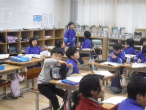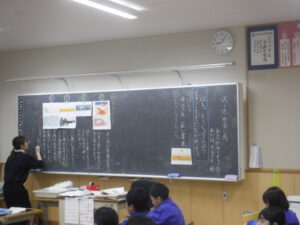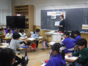 2年生の国語。中心教材の「スーホの白い馬」です。普段、國木先生の授業をいつも観ている四杉先生が、主務で授業をし、担任の國木先生がサブで、子供たちをサポートします。担任の國木先生にとっても、子供たちの学習の様子をじっくりと観る機会になっています。3学期に入って、いろんな先生が学級に入って、子供たちの様子を交代で観ています。