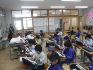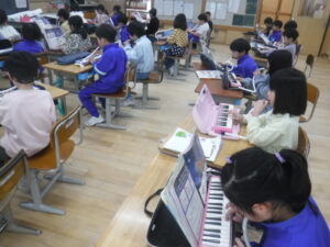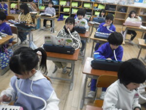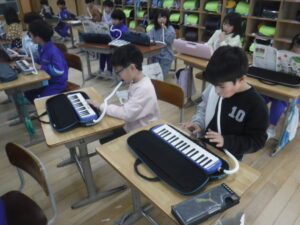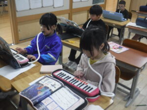 1年生の音楽を観ていると、「じゃあ」と四杉先生が、鍵盤ハーモニカの演奏を見せて(聴かせて)くださいました。上手です。何よりも、いっしょうけんめいに練習している姿が、すばらしいです。