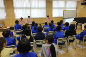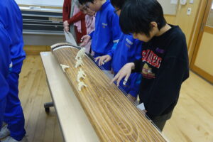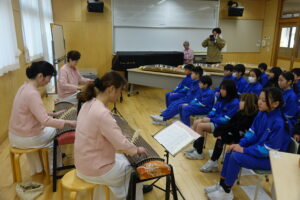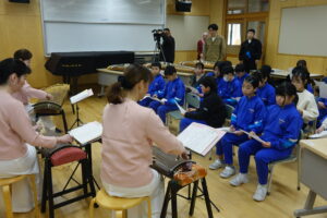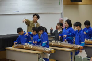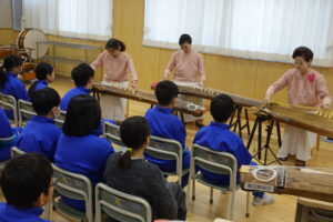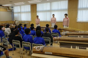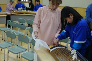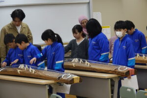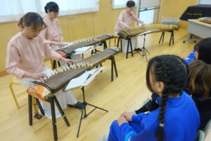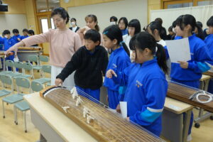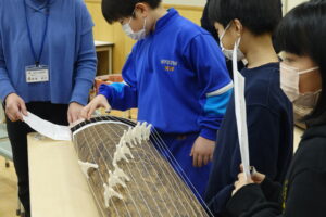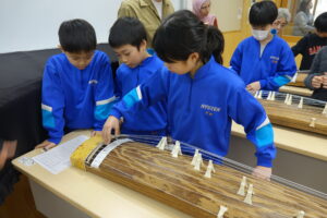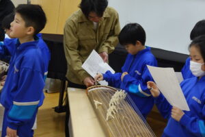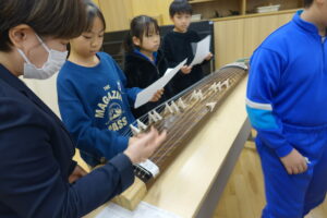 4年生を対象に音楽の特別授業として、「箏(こと)演奏体験」を実施しました。講師には、美桐(よしきり)会の寺林先生と皆さんにご来校いただきました。演奏を聴き、実際に琴を一人ずつ演奏させていただきました。A組、B組それぞれ45分の授業を2回取り組んでいただきました。たくさんの琴を実際に持ち込んでいただき、実際に演奏できたことは、本当にいい体験学習でした。「箏習いたい!」という子供の感想も多くありました。その音色にすっかり魅せられました。美桐会の皆様、ありがとうございました。