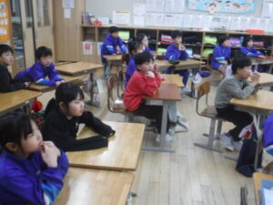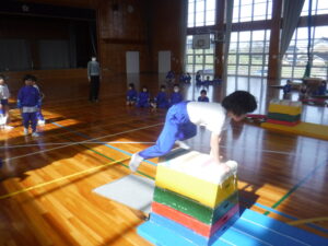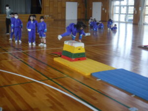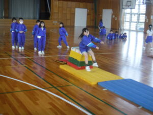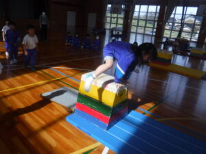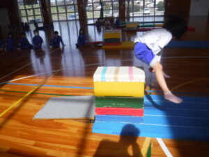 1年生が。「とび箱あそび」の発表会でした。1段から4段まで、自分が跳べるようになった段の「かいきゃく跳び」を披露しました。この日初めて、4段を跳べた子もいて、大喜びでした。1年生、とても上手で驚きました。なわとびもてつぼうも一生懸命にとりくんでいるのが、すばらしいです。