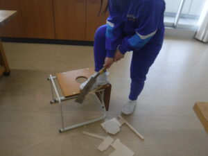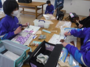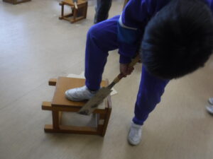 4年生の図工です。箱を作っているようですが、板をのこぎりで切断しています。しかし、この板が薄いうえに、細かく切る設計をしていますので、みんなのこぎりに苦戦しています。