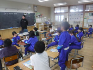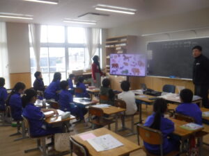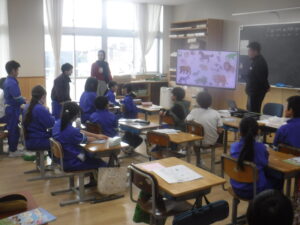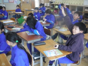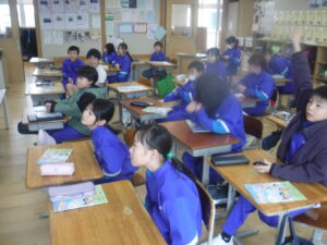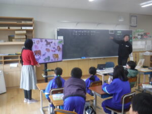 3年B組の外国語活動です。廣田先生がお休みですので、ナディア先生と担任の大島先生の授業です。動物の絵から、「色」の英語表現を学ぶ活動です。みなさんの姿勢が、ぐっと前向きになって取り組んでいるのが、わかります。大島先生の授業ということもあって、張り切って手が挙がります。とても意欲的な外国語活動でした。