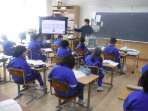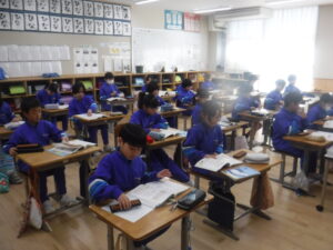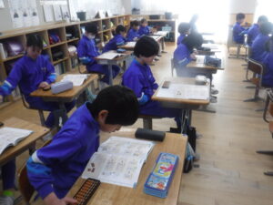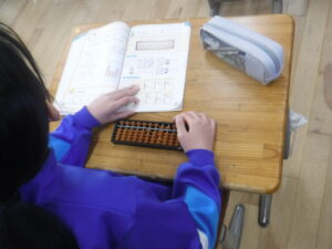 そろばん(3年)【3.18】 3年A組の算数科。なんと、「そろばん」をしていました。算数科の最後に「そろばん」なんですね。子供たちも興味深そうですが、なかなかに難しい。静かな教室に、玉を弾く音が響いていました。