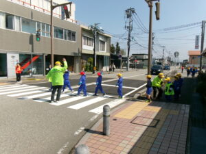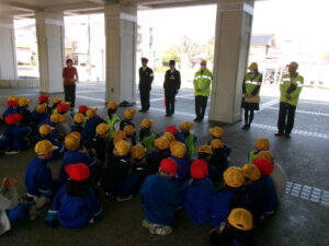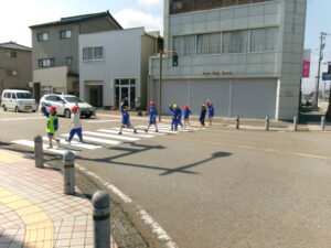 入善警察署から地域交通課長 藤井岳人警部様、さらに2名の警察署員の方、交通安全協会からも3名の方々からお話と実地での歩行指導をしていただきました。「歩くときは右側を歩く」「道を渡る際は右、左、右をちゃんと見て高く手をあげて渡る」等の命を守るための大切なことをお話と実地指導で教えてくださいました。子供たちは教わったとおりに歩行していました。明日も今日習ったことを行いながら安全に歩行