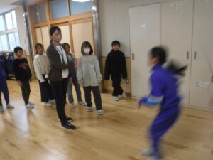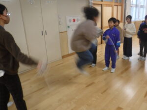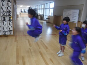 入小タイムは、「学級での長縄」でした。3年A組は、「前回より、かなり上手くなりました(浜岡先生)」。たしかに上手です。と思ったら、4年A組のスピードが全然、違いました。昨年の経験を生かして、高速長縄に挑んでいます。ひょっとしたら、高学年より跳ぶのではないでしょうか。今度は、5,6年生を見たいものです。1年生。縄跳びルームで、取り組んでいます。まず、縄に入れること。森田先生、廣川先生、清川先生の3人体制です。1年生が、縄を回すのは難しいですから。「1年生、日々、上達!(森田先生)」だそうです。やった分だけ、伸びますね。やりましょう!