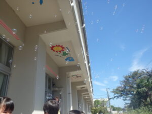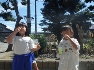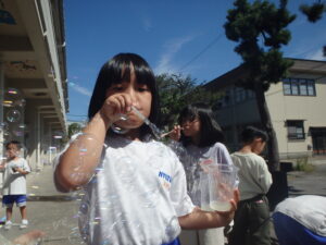 これは面白い!いろみず遊びのながれから、「シャボン玉」と「いろみず遊び」を合体させたそうです。森田先生の天才的な発想での新教材「あわあわ大変身」。作品が動くのですから、その思いがけないできばえに子供たちも大喜びでした。まさに、森田マジック!