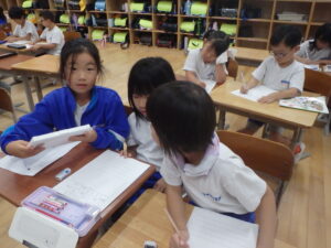 今日の一番感動したことです。2年生が1年生に「校歌ゆうぎ」を教えているのです。いろんなところで。2人と2人だったり、マンツーマンもあるのです。これは、究極の学習システムではないかと思いました。どちらも真剣。うまくできない子には、寄り添って教えています。最後にピロティで音楽が聞こえるので行ってみると、1,2年生全員で踊っています。先生が、「初めてなのに、とても上手でした!」と話しています。えっ、初めて練習したの?1年生もすごいが、2年生もすばらしい。やはり、学びのシステムが画期的なのでしょう。こんな難しいことを簡単そうに進める先生たちに感動しました。2回目は、どうなるのでしょう?