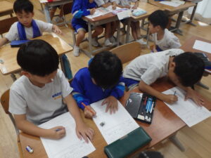 1年生、運動会の走る順番を確認しています。「白組男子がいいね」「森田賞!」1年生を集中させて、できるようにしていく先生の技術って、見ていて感心します。