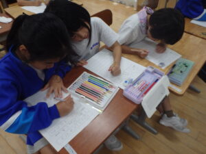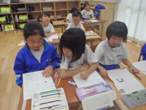 1年生は、「トーテムポール」のデザインを考えています。トーテムポールって、「まもり神」だそうです。自分のトーテムポールに何を守ってもらうのか「ねがい」が込めやすいですね。すらすら鉛筆が動きます。発想が豊かな1年生です。