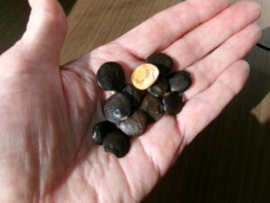 サッカーや鬼ごっこ等をして遊んでいました。その様子を石段に座って見ていたところ、男の子が私の鼻まで大人の握りこぶしくらいの大きさの石を近づけてきました。「草をつぶしてみたんだ。不思議なにおいがするよ」と言ってきたので嗅いでみると香ばしい何とも言えない春っぽい香りがしました。そのことを彼に伝えると満足したようにアスレチックの方へ駆けて行きました。そのあと、女の子が「種拾ったの。なんの種?」と種を見せて聞いてきました。なんの種か分からなかったので「分からないので知っていそうな人に聞いてみるよ」と伝えました。どなたか分かる方はおられるでしょうか。分かるようでしたら教えてください。