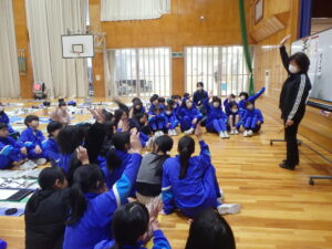 4年生は、体育館で実施しました。4年生の多くの子は、よく話を聞けるので、素直に文字に表していました。