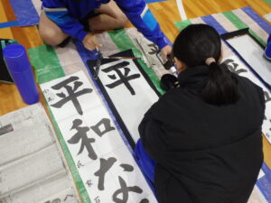 書初めの「特別教室」です。書家の上島芳子先生(町教育センター勤務)が指導に来てくださっています。本来は、体育館ですが、書初めが初めての3年生は、A組、B組ごとに教室で実施しました。